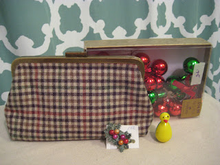 I scored a J Crew wool plaid clutch for $2, a box of mercury glass ornament picks for 75 cents, a tiny weighted duck for a quarter and a pair of sweet vintage holly earrings for $1.50.